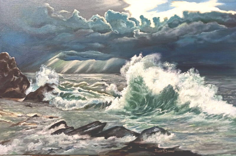 “Chi ha sbarrato con porte il mare, quando impetuoso è uscito dal grembo, quando l’ho vestito di nubi e l’ho avvolto nella fitta oscurità, quando gli ho posto un limite e gli ho messo sbarre e porte, dicendogli: ‘Puoi arrivare fin qui, e non oltre; qui si fermeranno le tue orgogliose onde’?” Sacra Bibbia (Giobbe 38:8-11) Olio su tela 40x60